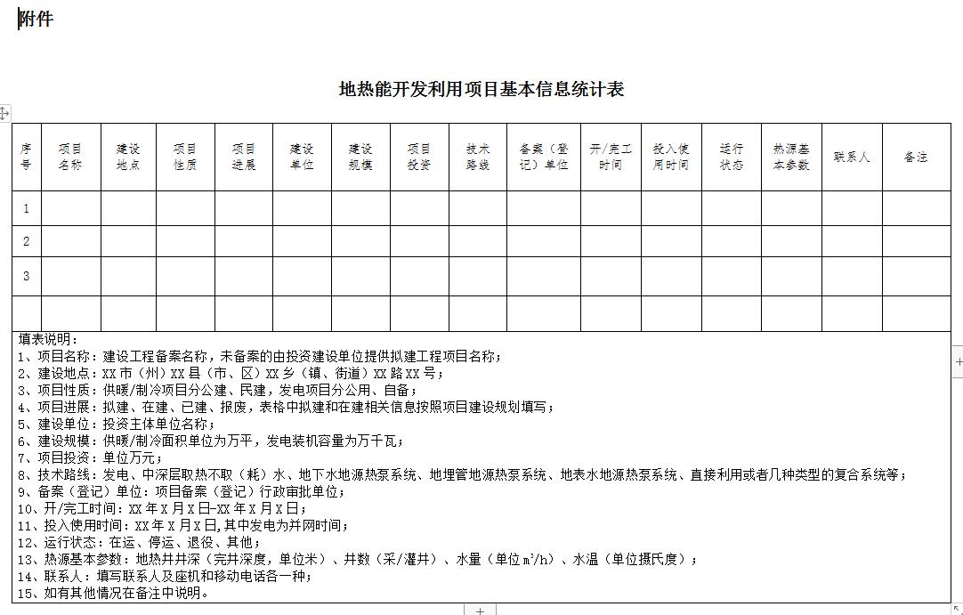 四、國家可再生能源信息管理中心和國家地熱中心要加強溝通,做好地熱信息管理平臺之間的數據接口,統一項目編碼。各平臺要能夠按照附件格式導出數據。國家可再生能源信息管理中心負責匯總各省(區、市)能源主管部門正式提供的數據,于每年年底前上報我局。