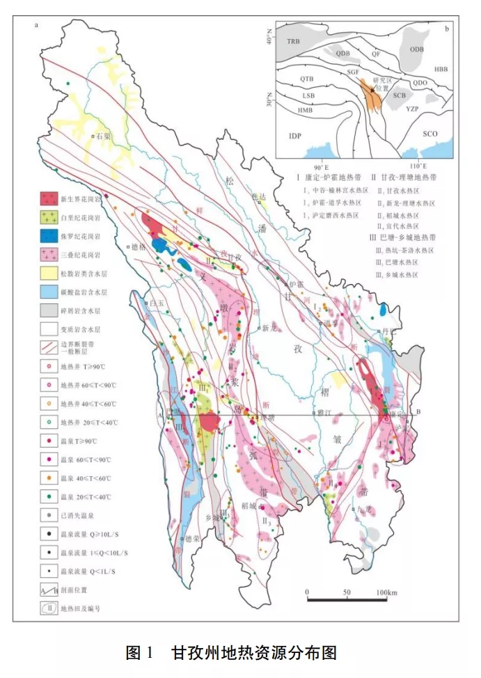 據最新調查成果,甘孜州的水熱活動強烈,全州共有溫泉點264 個,地熱井17 口, 除色達縣外,其余17 縣均有水熱活動。 全州溫泉分布主要受 3 條深大斷裂帶和數條主要大斷裂(德格-鄉城大斷裂帶、玉科大斷裂帶、 陳支大斷裂帶等)控制,形成了3個主要地熱帶和9個水熱活動集中分布區的基本分布格局。水熱活動強烈區一般位于主干斷裂帶及其轉 折的部位,以康定縣、甘孜縣、理塘縣、巴塘縣 為典型代表。