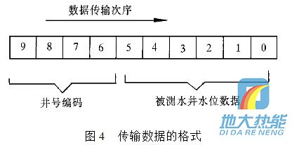 現在通過單片機輸出控制一組由三極管組成的電子開關,由電子開關代替按鍵功能完成數據輸入.例如:要傳輸十進制數據0,1,2,3,4,5,6,7,8,9,單片機依次輸出接通雙音頻編碼器輸入數字按鍵0,1,2,3,4,5,6,7,8,9對圖4 傳輸數據的格式應的電子開關的控制信號,則該組數據經雙音多頻編碼器轉換為雙音頻信號. 雙音多頻編碼器在單片機控制下,定時“撥通”水位監測中心電話號碼,在水位監測中心計算機應答并“摘機”的情況下,通過這條已接通的電話線路,將所測的水位數據,經 過雙音多頻編碼器編碼后傳送到監控中心. 要傳輸的數據格式為:數據長度為10位十進制數,其中高四位為井號編碼,低六位為所測量的水井水位數據,水位數據分整數和小數兩部分.數據傳輸的方向是從高位到底位.數據格式如圖4所示.
